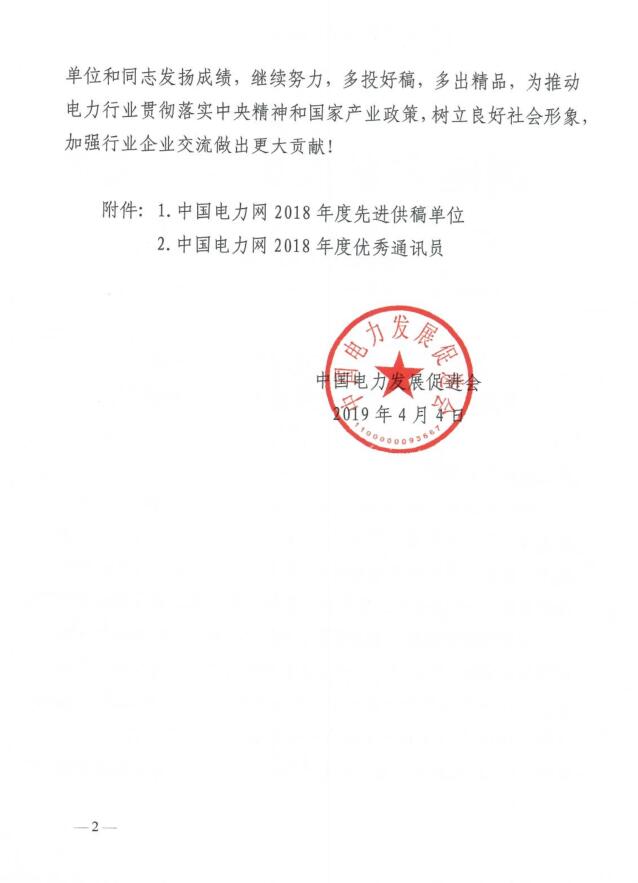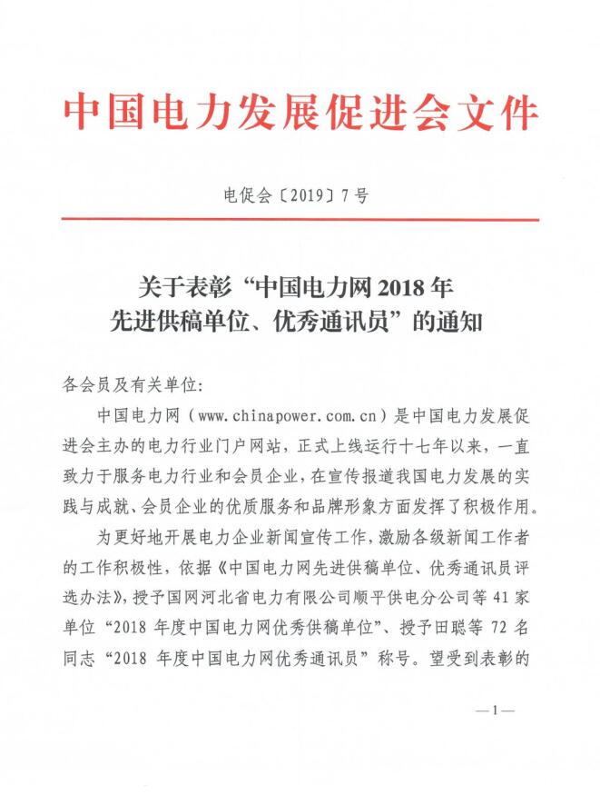 關(guān)于表彰“中國電力網(wǎng)2018年先進供稿單位、優(yōu)秀通訊員”的通知