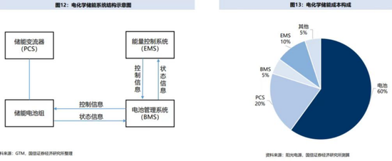 根據(jù)國(guó)信證券經(jīng)濟(jì)研究所測(cè)算,在電化學(xué)儲(chǔ)能系統(tǒng)的成本構(gòu)成中,電池占比約60%,儲(chǔ)能變流器PCS占比約20%。此外,能量控制系統(tǒng)占比約10%,電池管理系統(tǒng)占比5%左右。