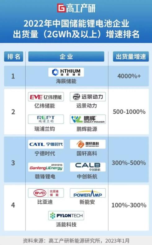 而從出貨量增速來看,2022年增速排名第一的為海辰儲能,達(dá)40倍以上。億緯鋰能、遠(yuǎn)景動力、瑞浦蘭鈞、鵬輝能源排名第二檔,增速在5倍-10倍之間。寧德時代、國軒高科、贛鋒鋰電、中創(chuàng)新航位列第三檔,增速達(dá)3倍-5倍。比亞迪、派能科技、新能安出貨量增速達(dá)1倍-3倍。