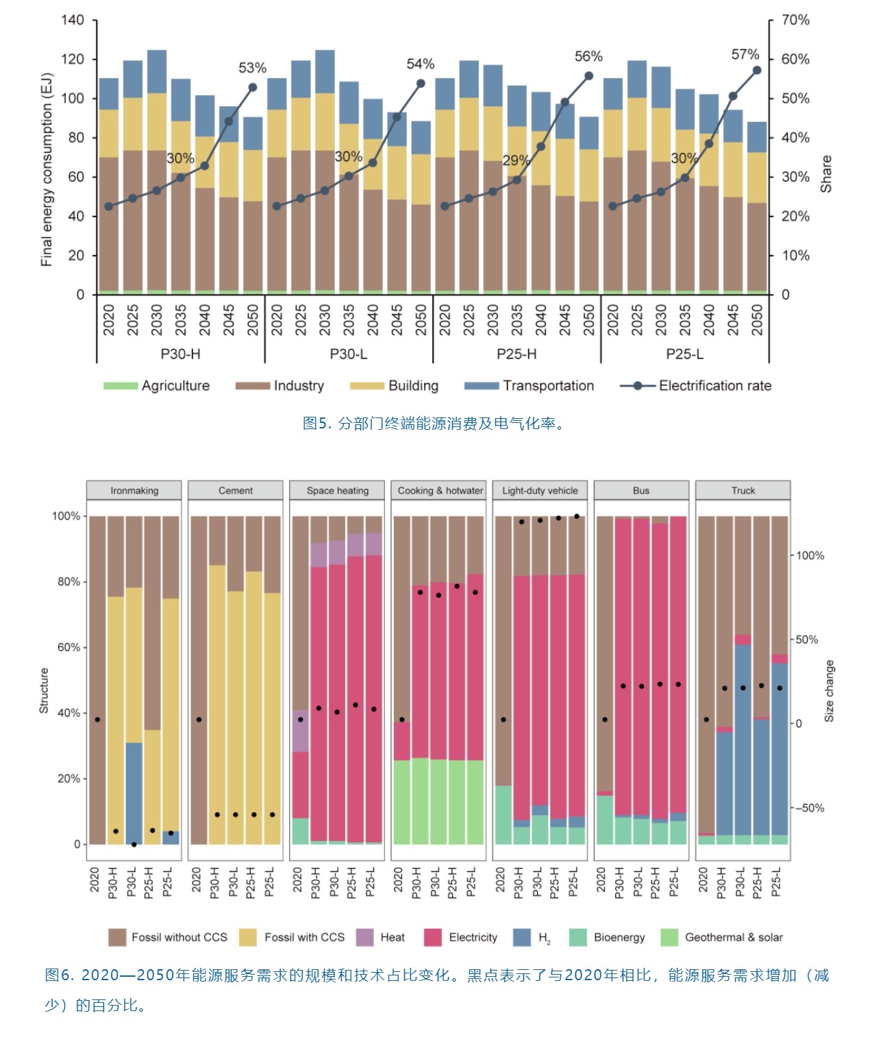 產(chǎn)業(yè)結(jié)構(gòu)調(diào)整、能源效率提高和清潔燃料替代是能源需求部門能耗和排放下降的三大支柱。據(jù)估計(jì),第二產(chǎn)業(yè)在國(guó)民經(jīng)濟(jì)中的比重逐年下降,到2050年,這一比重將比2020年減少約9%,而第三產(chǎn)業(yè)比重將增加10%。如圖5所示,對(duì)于P30情景,中國(guó)的終端能源消費(fèi)將在2030年以125 EJ達(dá)峰,而對(duì)于P25情景,達(dá)峰時(shí)間將提前到2025年左右,峰值水平也略低(119 EJ)。兩組情景都顯示,2050年中國(guó)終端能源消費(fèi)將穩(wěn)定在90 EJ左右。未來的30年,電氣化率將持續(xù)上升,從目前的23%增加到2035年的30%,然后加速達(dá)到2050年的近60%。技術(shù)進(jìn)步和終端能源的電氣化推動(dòng)能源效率的快速提高。在圖6中,部分能源服務(wù)需求的規(guī)模以及技術(shù)占比變化以圖表的形式展示。