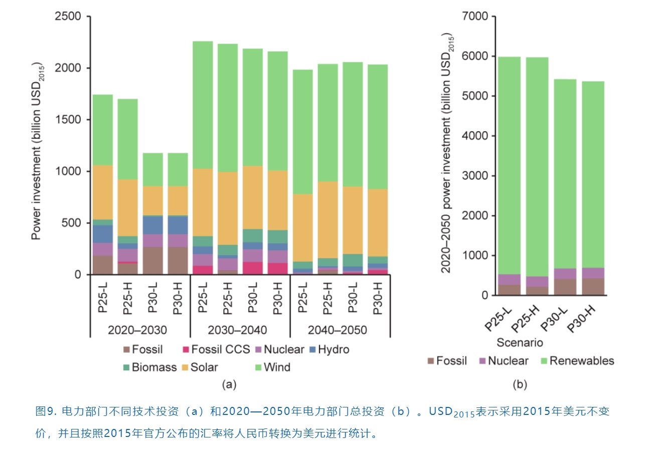中國(guó)持續(xù)的清潔能源投資為低碳轉(zhuǎn)型提供了堅(jiān)實(shí)的基礎(chǔ)。為了實(shí)現(xiàn)中國(guó)的碳中和目標(biāo),需要大幅擴(kuò)大低碳投資規(guī)模,并不斷提高綠色投資比重。如圖9所示,從現(xiàn)在到2050年,大約需要6萬億美元的電力投資來支持電力系統(tǒng)的低碳轉(zhuǎn)型,其中可再生能源投資約占90%??偟膩碚f,不同的碳中和時(shí)間對(duì)于電力行業(yè)的投資額影響不大,但不同的碳達(dá)峰時(shí)間對(duì)其投資有較大影響。未來10年是能源轉(zhuǎn)型和升級(jí)的重要窗口期,P25情景下,電力部門年均投資額超過1700億美元,而P30情景下投資額則不足1200億美元。最大的投資缺口在于風(fēng)能和太陽能發(fā)電技術(shù),預(yù)期P25情景(超過1.2萬億美元)近十年的風(fēng)能和太陽能投資是P30情景的兩倍。如果在2030年前沒有采取強(qiáng)有力的行動(dòng),則在未來10年可能還會(huì)新建大量未加裝CCS技術(shù)的火力發(fā)電廠,從而增加了碳鎖定和資產(chǎn)擱置的風(fēng)險(xiǎn)。2030年以后,每年仍將有超過2000億美元的電力投資,而沒有加裝CCS的火力發(fā)電廠將幾乎不再發(fā)展。