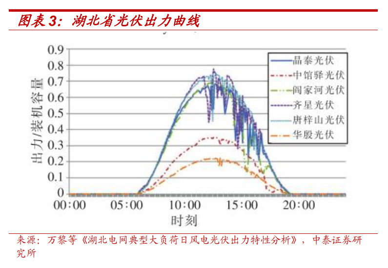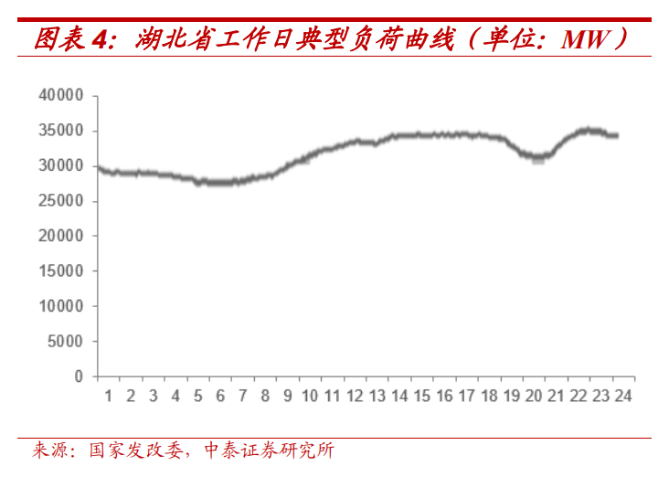 是一天中的最低位。光伏出力曲線和負(fù)荷曲線相對更適配,白天為曲線高位,但以湖北省為例,20時至23時負(fù)荷仍處于相對高位,而此時光伏出力為0。因此當(dāng)新能源發(fā)電量占比達(dá)到一定程度,電源和負(fù)荷的曲線差異將對電網(wǎng)的運行效率和安全造成沖擊,或?qū)е麓罅織夛L(fēng)棄光現(xiàn)象。