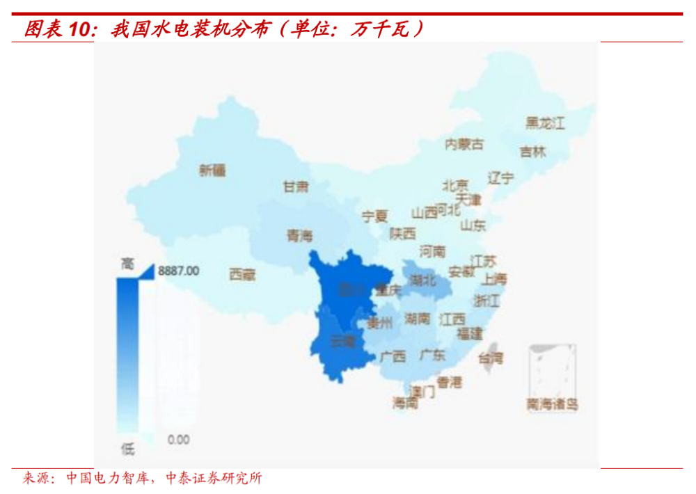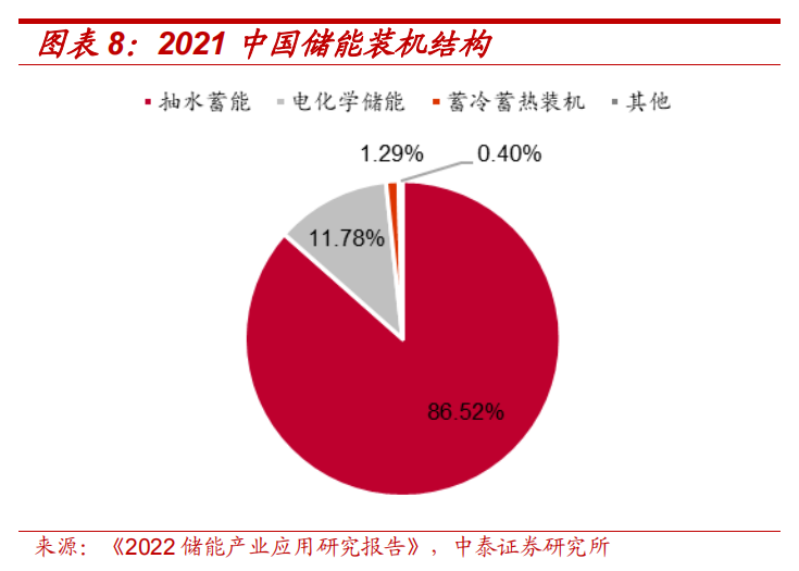 2021年中國抽水蓄能裝機功率38GW,占比全部儲能的86.52%,電化學(xué)儲能裝機功率5GW,占比11.78%,抽水蓄能是我國存量儲能的主要形式。2021年中國新增抽水蓄能裝機5GW,占比71.14%,電化學(xué)儲能新增2GW,占比24.94%,電化學(xué)儲能裝機增速超過抽水蓄能。抽水蓄能需要尋找合適地形及水域,同時可能涉及搬遷移民問題,外部限制因素較多,建設(shè)期通常長達(dá)數(shù)年。我國水電資源主要集中在南方地區(qū)尤其是西南地區(qū),西北等地區(qū)缺發(fā)建設(shè)大型抽蓄配套新能源的條件。而電化學(xué)儲能則對外界條件要求不高,建設(shè)期較短,單體投資小,因而成為新能源配儲的普遍選擇。