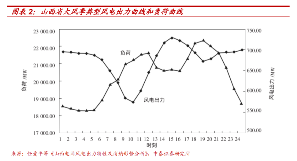 根據(jù)山西省大風(fēng)季典型風(fēng)電出力曲線和負(fù)荷曲線可見,風(fēng)電出力和負(fù)荷二者具有較大差異,風(fēng)電在21時至次日5時出力處于相對高位,而此時用電負(fù)荷卻