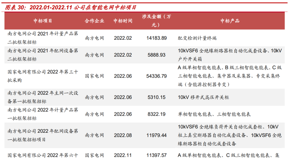 公司海內(nèi)外訂單飽滿,預(yù)計(jì)未來(lái)業(yè)績(jī)將持續(xù)放量。在 2021 年,科陸 電子智能電表產(chǎn)品和用電信息采集終端產(chǎn)品系列的總中標(biāo)金額約 9.1 億元,以中標(biāo)額計(jì)算的整體市場(chǎng)占有率達(dá)到約 2.67%。其中,公司在 國(guó)家電網(wǎng)招標(biāo)采購(gòu)項(xiàng)目中標(biāo)約 5.96 億元,在南方電網(wǎng)計(jì)量產(chǎn)品框架招 標(biāo)項(xiàng)目中標(biāo)約 2.19 億元,在各省電網(wǎng)公司 2021 年計(jì)量箱招標(biāo)項(xiàng)目 中標(biāo)約 1.69 億元。自 2022 年起,上半年中,公司在國(guó)網(wǎng)第一次電能 表招標(biāo)及南網(wǎng)第一批框架招標(biāo)中占比達(dá) 4.1%、5.6%,位列中標(biāo)金額的 第一梯隊(duì),成功實(shí)現(xiàn)在兩網(wǎng)市場(chǎng)份額占比提升;截至 11 月,公司已實(shí) 現(xiàn) 5 次中標(biāo),中標(biāo)總金額達(dá) 11.14 億元,同比 2021 年中標(biāo)總金額 7.44 億元,公司國(guó)內(nèi)訂單量實(shí)現(xiàn)大幅提升。海外方面,公司持續(xù)在海外電表 業(yè)務(wù)深耕,業(yè)務(wù)主要集中在非洲、亞太、南美等地區(qū),并在歐洲、美洲 多個(gè)國(guó)家實(shí)現(xiàn)業(yè)績(jī)突破。