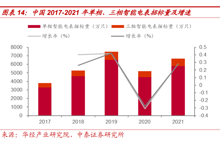 智能電表需求觸底反彈,招標(biāo)量整體保持上升趨勢(shì)。我國(guó)智能電表市場(chǎng) 需求主要來(lái)源于國(guó)家電網(wǎng)和南方電網(wǎng),2020 年受疫情影響國(guó)網(wǎng)建設(shè)進(jìn)度 放緩,因此單相、三相智能電表招標(biāo)量同比下降 30.8%、27.5%。隨疫 情好轉(zhuǎn),市場(chǎng)需求恢復(fù),智能電網(wǎng)招標(biāo)量觸底反彈,單相、三相智能電 表招標(biāo)量同比上升 28.3%、27.7%,其中國(guó)家電網(wǎng)招標(biāo)量達(dá) 6674 萬(wàn)只, 同比增長(zhǎng) 28%,南方電網(wǎng)招額達(dá) 26 億元,同比增長(zhǎng) 49.8%。