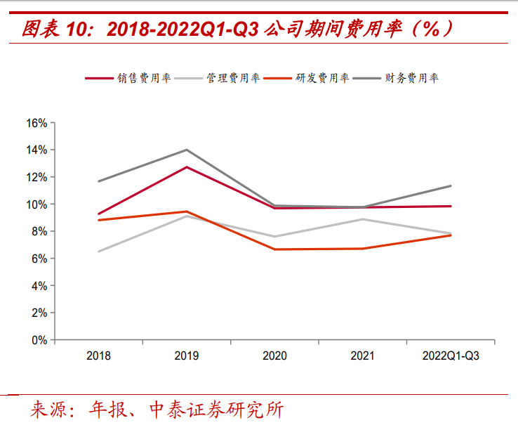 期間費(fèi)用呈下降趨勢(shì),但仍有較大進(jìn)步空間。2019-2021 年公司期間費(fèi) 用率分別為 36.3%/45.3%/33.8%/35.1%/36.7%,雖然呈現(xiàn)總體下降趨勢(shì), 但仍高于同行平均值,費(fèi)用管控能力有望進(jìn)一步提升。其中 2022 年前 三季度銷售/管理/研發(fā)/財(cái)務(wù)費(fèi)用率分別為 9.8%/7.8%/7.7%/11.3%,打破 前兩年的下降趨勢(shì),主要是因?yàn)楣臼杖塍w量較低,規(guī)模效應(yīng)尚未體現(xiàn), 且公司近年來(lái)營(yíng)運(yùn)資金緊缺,導(dǎo)致公司主動(dòng)放棄大量周期長(zhǎng)、墊資金額高的訂單,也限制了營(yíng)收規(guī)模的增長(zhǎng),導(dǎo)致各方面人效降低。但隨著公 司業(yè)務(wù)擴(kuò)張的不斷推進(jìn)和資金鏈的緩解,期間費(fèi)用率有望好轉(zhuǎn)。