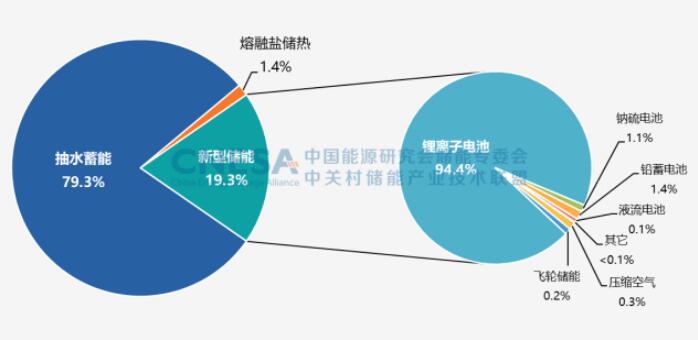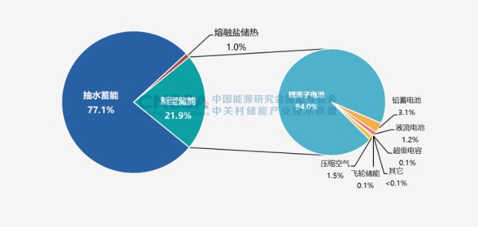 2022年,中國新增投運(yùn)電力儲(chǔ)能項(xiàng)目裝機(jī)規(guī)模首次突破15GW,達(dá)到16.5GW,其中,抽水蓄能新增規(guī)模9.1GW,同比增長75%;新型儲(chǔ)能新增規(guī)模創(chuàng)歷史新高,達(dá)到7.3GW/15.9GWh,功率規(guī)模同比增長200%,能量規(guī)模同比增長280%;新型儲(chǔ)能中,鋰離子電池占據(jù)絕對(duì)主導(dǎo)地位,比重達(dá)97%,此外,壓縮空氣儲(chǔ)能、液流電池、鈉離子電池、飛輪等其它技術(shù)路線的項(xiàng)目,在規(guī)模上有所突破,應(yīng)用模式逐漸增多。