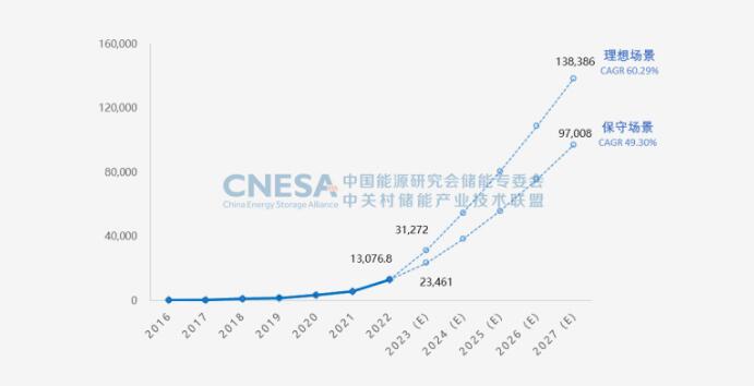 CNESA自2014年起對(duì)中國儲(chǔ)能市場(chǎng)規(guī)模進(jìn)行預(yù)測(cè),本版白皮書中,CNESA基于保守場(chǎng)景(定義為政策執(zhí)行、成本下降、技術(shù)改進(jìn)等因素未達(dá)預(yù)期的情形)和理想場(chǎng)景(定義為各省儲(chǔ)能規(guī)劃目標(biāo)順利實(shí)現(xiàn)的情形)對(duì)2023-2027年中國新型儲(chǔ)能市場(chǎng)的規(guī)模和發(fā)展趨勢(shì)進(jìn)行預(yù)測(cè)。
