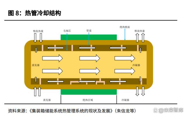 相變材料和熱管冷卻仍處于在研階段,成本和穩(wěn)定性是影響其投產(chǎn)的重要原 因。相變材料冷卻是使電池單體直接接觸相變材料,利用其相變過程吸收熱 量實(shí)現(xiàn)對鋰離子電池的冷卻。相變材料冷卻可以明顯提升儲能系統(tǒng)溫度分布 的均勻性,但其價(jià)格較高,且當(dāng)相變材料吸熱時,其體積變化明顯,容易對 儲能系統(tǒng)的工作性能產(chǎn)生影響。熱管是一種利用介質(zhì)在吸熱端的蒸發(fā)帶走熱 量,再在放熱端通過冷凝的方式將熱量傳遞到外界的裝置,這一冷卻技術(shù)已 相對成熟,但其成本較高,在手機(jī)等電子設(shè)備上使用較多,應(yīng)用于儲能系統(tǒng) 上性價(jià)比低。