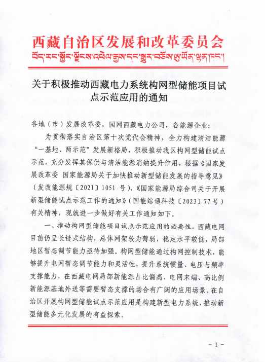 7月24日,西藏自治區(qū)發(fā)展和改革委員會印發(fā)關(guān)于積極推動西藏電力系統(tǒng)構(gòu)網(wǎng)型儲能項(xiàng)目試點(diǎn)應(yīng)用的通知(以下簡稱“通知”)。