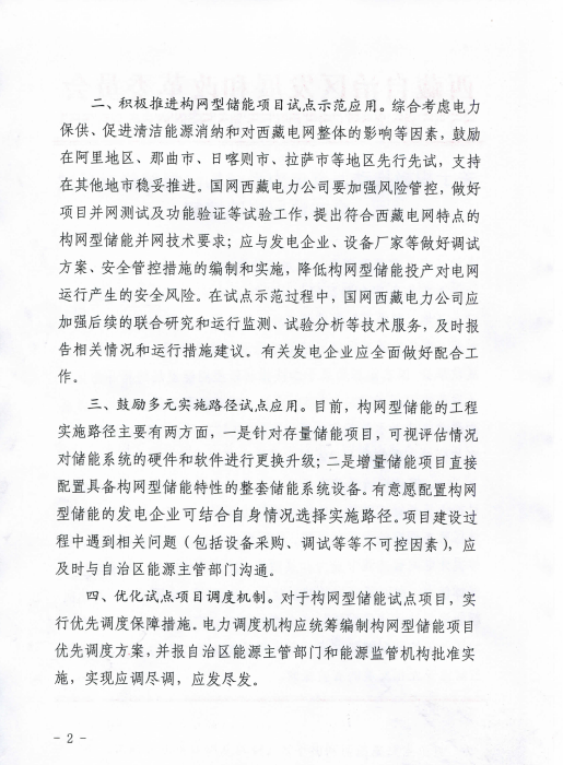 積極推進(jìn)構(gòu)網(wǎng)型儲能項(xiàng)目試點(diǎn)示范應(yīng)用。綜合考慮電力保供、促進(jìn)清潔能源消納和對西藏電網(wǎng)整體的影響等因素,鼓勵在阿里地區(qū)、那曲市、日喀則市、拉薩市等地區(qū)先行先試,支持在其他地市穩(wěn)妥推進(jìn)。國網(wǎng)西藏電力公司要加強(qiáng)風(fēng)險管控,做好項(xiàng)目并網(wǎng)測試及功能驗(yàn)證等試驗(yàn)工作,提出符合西藏電網(wǎng)特點(diǎn)的構(gòu)網(wǎng)型儲能并網(wǎng)技術(shù)要求;應(yīng)與發(fā)電企業(yè)、設(shè)備廠家等做好調(diào)試方案、安全管控措施的編制和實(shí)施,降低構(gòu)網(wǎng)型儲能投產(chǎn)對電網(wǎng)運(yùn)行產(chǎn)生的安全風(fēng)險。