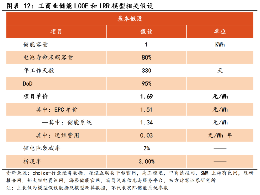 為盡量便于理解,東方財(cái)富證券僅考慮初始投資、年度運(yùn)行天數(shù)、充放策略等儲(chǔ)能系統(tǒng)側(cè)的指標(biāo)變化,計(jì)算理想情況下,1kWh 工商業(yè)儲(chǔ)能系統(tǒng)在100%利用的情況下的 LCOE(Levelized Cost of Energy,平準(zhǔn)化度電成本) 和IRR。
