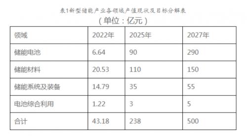 文件明確,到2027年,新型儲能產(chǎn)業(yè)產(chǎn)值規(guī)模超500億元,儲能電池產(chǎn)能達(dá)40GWh,新型儲能電站裝機(jī)規(guī)模達(dá)260萬千瓦以上。力爭培育產(chǎn)值超過100億元企業(yè)1家以上,超50億元企業(yè)5家以上,超10億元企業(yè)10家以上。
