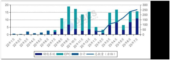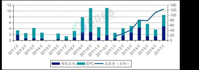 中國(guó)電池工業(yè)協(xié)會(huì)儲(chǔ)能分會(huì)近日發(fā)布的2023中國(guó)新型儲(chǔ)能7月研究簡(jiǎn)報(bào)顯示,儲(chǔ)能市場(chǎng)持續(xù)火熱,7 月儲(chǔ)能系統(tǒng)招標(biāo)規(guī)模創(chuàng)歷史新高。分會(huì)共統(tǒng)計(jì)到儲(chǔ)能招標(biāo)項(xiàng)目252個(gè),總規(guī)模達(dá)到15.8GWh ,環(huán)比增長(zhǎng)1% ,同比增長(zhǎng)425% 。其中,儲(chǔ)能EPC項(xiàng)目共計(jì)171個(gè),規(guī)模為4.9GWh ,儲(chǔ)能系統(tǒng)項(xiàng)目共計(jì)81個(gè),規(guī)模為10.9GWh。
