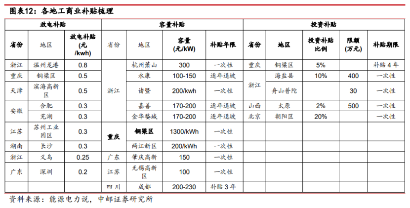 另外,2022年以來(lái),工商業(yè)儲(chǔ)能直接補(bǔ)貼政策頻發(fā),鼓勵(lì)分布式光伏配儲(chǔ),補(bǔ)貼方式包括容量補(bǔ)貼、放電補(bǔ)貼和投資補(bǔ)貼等。