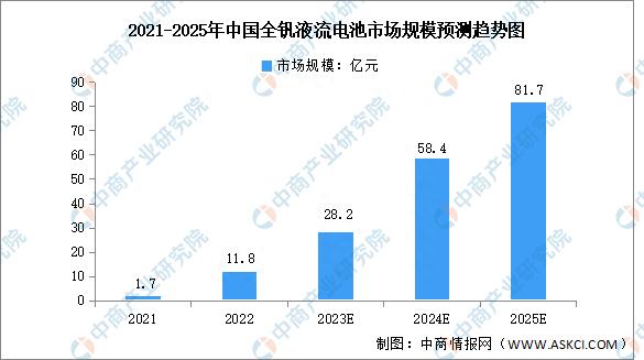 全釩液流電池的市場空間主要來自于儲能需求的增長以及自身滲透率的提升,隨著技術的進步及生產成本的降低,全釩液流電池市場空間將逐步擴大。數據顯示,2022年全釩液流電池市場規(guī)模約11.8億元,中商產業(yè)研究院分析師預測,2023年我國全釩液流電池市場規(guī)模將達28.2億元,預計2025年將增至81.7億元,2021-2025年復合年均增長率達163.3%。
