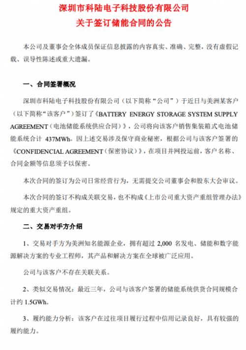 據(jù)悉,交易對手方為美洲知名能源企業(yè),擁有超過2,000名發(fā)電、儲能和數(shù)字能源解決方案的專業(yè)工程師,其產(chǎn)品和解決方案在全球被廣泛應(yīng)用。公告顯示,最近三年,科陸電子與該客戶簽署的儲能系統(tǒng)供貨合同規(guī)模合計(jì)約1.5GWh。