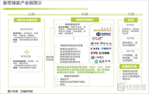 根據(jù)艾瑞研究院的梳理,儲(chǔ)能產(chǎn)業(yè)鏈的上游主要是電池材料的原材料供應(yīng)商和制造商;中游則是系統(tǒng)建設(shè)環(huán)節(jié),包括基礎(chǔ)技術(shù)、系統(tǒng)集成安裝和系統(tǒng)運(yùn)維三大部分,市場(chǎng)中最知名的寧德時(shí)代、億鋰緯能、陽(yáng)光電源、天合光能等都處于中游;下游則是發(fā)電側(cè)、電網(wǎng)側(cè)、用戶側(cè)的應(yīng)用及服務(wù)。