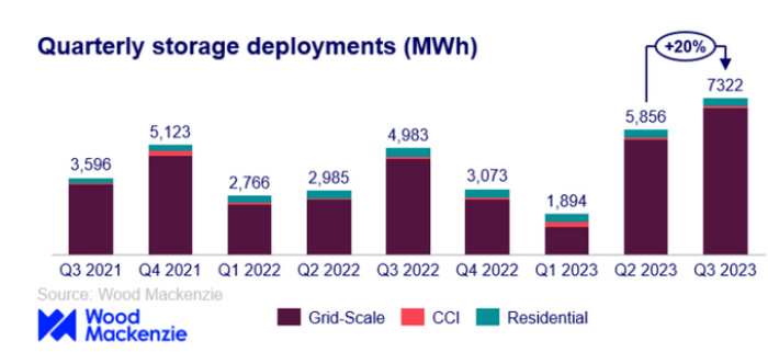 根據(jù)調(diào)研機(jī)構(gòu)Wood Mackenzie日前發(fā)布的研究報(bào)告,美國(guó)儲(chǔ)能行業(yè)又經(jīng)歷了一個(gè)破紀(jì)錄的季度,在2023年第三季度部署的儲(chǔ)能系統(tǒng)的裝機(jī)容量為2354MW,儲(chǔ)能容量為7322MWh。