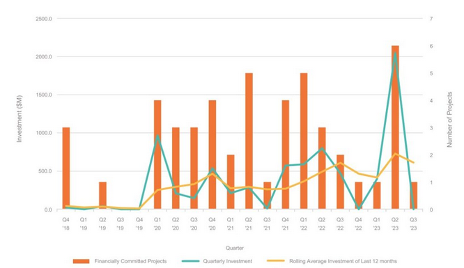 在今年第二季度,包括Waratah Super Battery電池儲能項目在內(nèi)的六個大型電池儲能系統(tǒng)獲得投資承諾,首次在一個季度內(nèi)突破10億澳元大關(guān)。而在今年第三季度,只有一個儲能項目獲得投資,是一個在采礦場部署的太陽能+儲能混合項目。