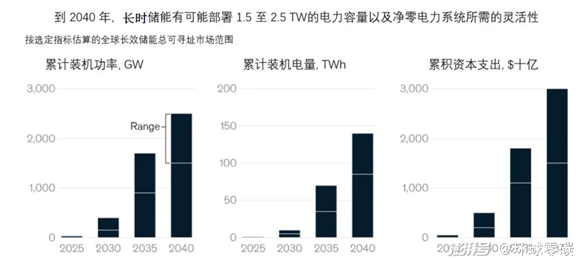 2021年,全球知名咨詢公司麥肯錫和長期儲能協(xié)會(huì)(LDES)發(fā)布的一份報(bào)告表示,到2040年,LDES 有可能在全球部署 1.5 至 2.5 TW)(太瓦)的裝機(jī)容量,是當(dāng)前部署的總儲能容量的8到15倍。對應(yīng)的儲能容量是 85-140TWh)(太瓦時(shí) )。