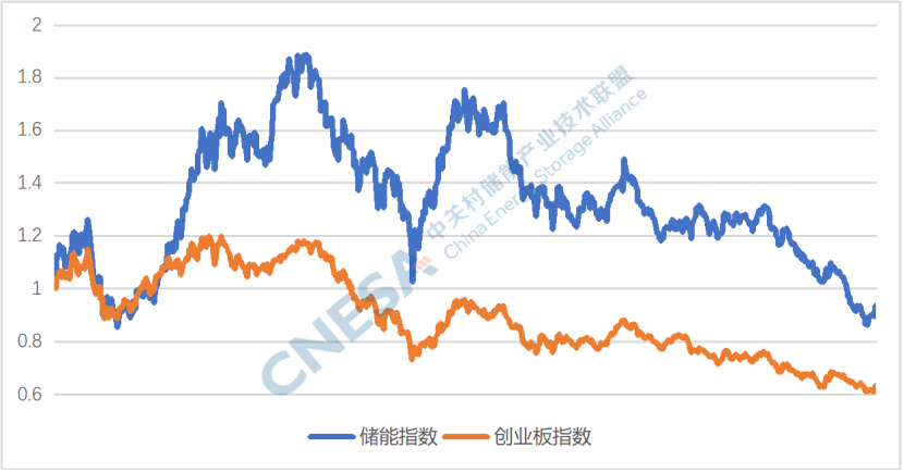 圖2: 2021-2023年儲能指數(shù)與創(chuàng)業(yè)版指數(shù)的對比
