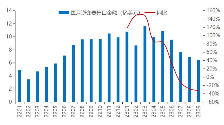2023年9月國內出口光儲逆變器金額6.5億美元,同比-33%,環(huán)比-6%;