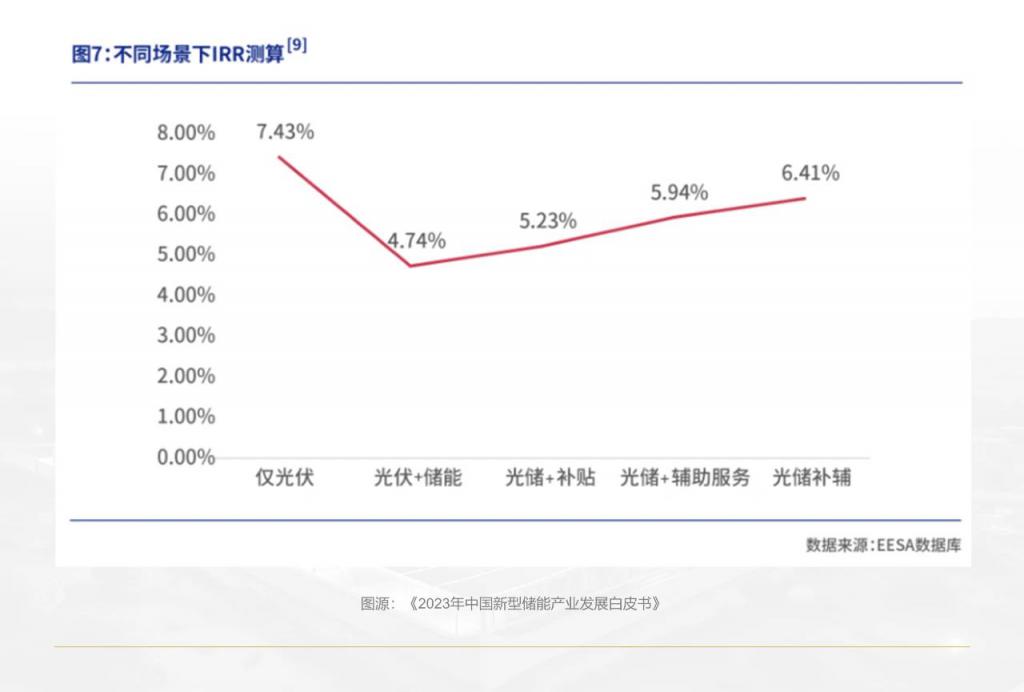 《2023 中國(guó)新型儲(chǔ)能行業(yè)發(fā)展白皮書(shū)》測(cè)算顯示:以?xún)?nèi)蒙古某 100MW 光伏發(fā)電項(xiàng)目、配套 20MW/40MWh 儲(chǔ)能電站為例,其內(nèi)部收益率(IRR)在僅光伏發(fā)電的情景下,高達(dá) 7.43%;而配上儲(chǔ)能后,即便獲得政府補(bǔ)貼同時(shí)參與輔助服務(wù),IRR 也僅 6.41%。