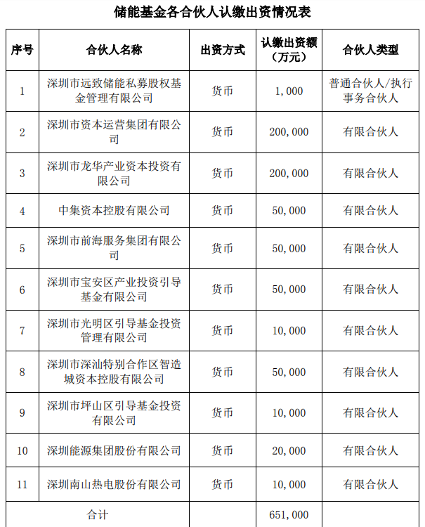 根據(jù)公告顯示,深圳南山熱電股份有限公司作為有限合伙人以自有資金1億元投資深圳市新型儲(chǔ)能產(chǎn)業(yè)股權(quán)基金合伙企業(yè)(有限合伙),該儲(chǔ)能基金總獲65.1億出資。