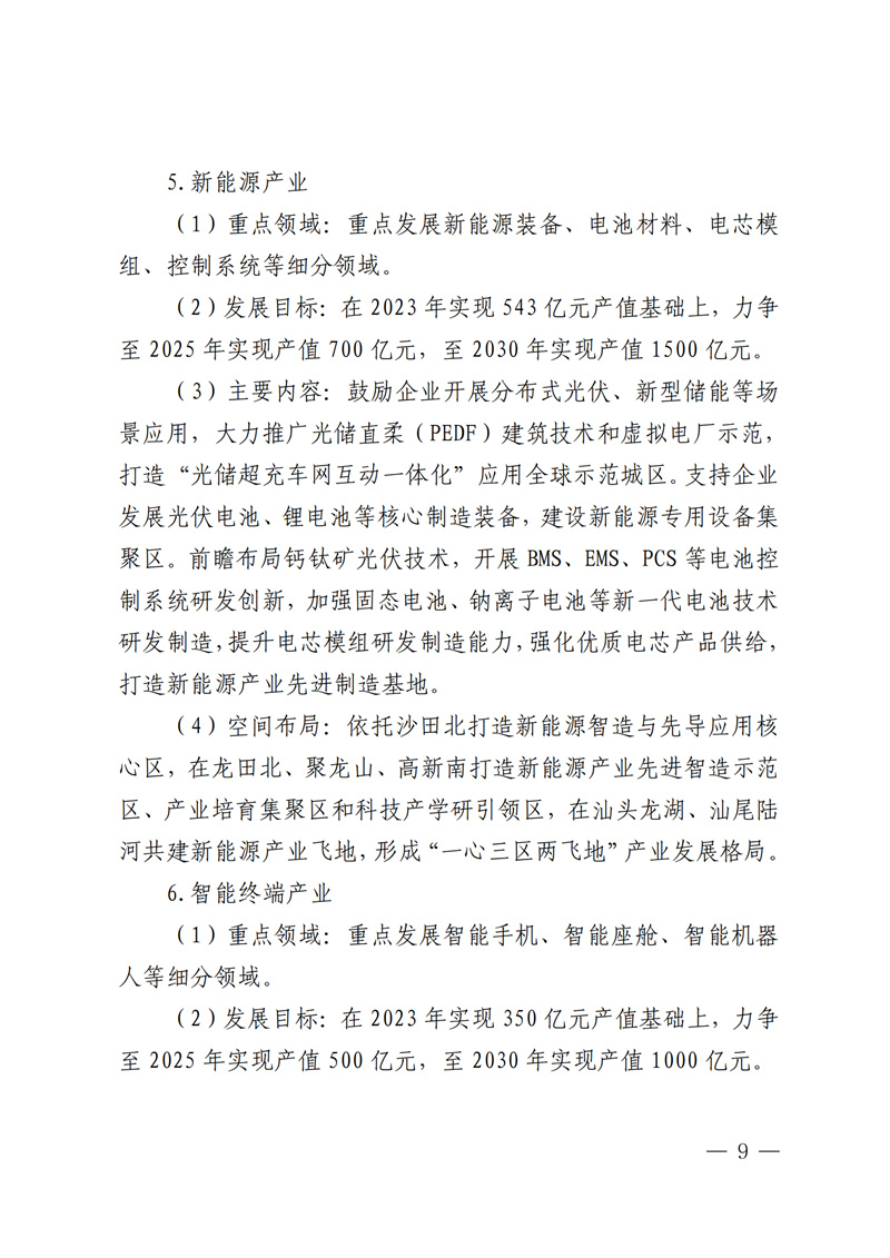 3月14日,坪山區(qū)人民政府發(fā)布關(guān)于打造具備國際競爭力的產(chǎn)業(yè)集群和培育具有發(fā)展?jié)摿Φ漠a(chǎn)業(yè)集群的意見,文件指出,在2023年實現(xiàn)543億元產(chǎn)值基礎(chǔ)上,力爭至2025年實現(xiàn)產(chǎn)值700億元,至2030年實現(xiàn)產(chǎn)值1500億元。主要內(nèi)容涉及鼓勵企業(yè)開展分布式光伏、新型儲能等場景應(yīng)用,大力推廣光儲直柔(PEDF)建筑技術(shù)和虛擬電廠示范,打造“光儲超充車網(wǎng)互動一體化”應(yīng)用全球示范城區(qū)。支持企業(yè)發(fā)展光伏電池、鋰電池等核心制造裝備,建設(shè)新能源專用設(shè)備集聚區(qū)。前瞻布局鈣鈦礦光伏技術(shù),開展BMS、EMS、PCS等電池控制系統(tǒng)研發(fā)創(chuàng)新,加強固態(tài)電池、鈉離子電池等新一代電池技術(shù)研發(fā)制造,提升電芯模組研發(fā)制造能力,強化優(yōu)質(zhì)電芯產(chǎn)品供給,打造新能源產(chǎn)業(yè)先進制造基地。