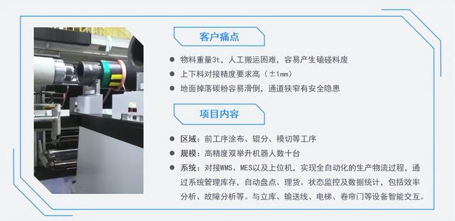 在某儲能頭部企業(yè)實(shí)現(xiàn)產(chǎn)線物流無人化的項(xiàng)目中,磅旗無人工場數(shù)字化方案籠罩前段與中段產(chǎn)線物流全過程,包含涂布上下料、極卷緩存搬運(yùn)、輥壓分切上料、輥壓分切下料、模切上下料、卷繞上料、隔閡運(yùn)輸、空卷筒回流運(yùn)輸?shù)裙に囘^程。實(shí)現(xiàn)全過程主動化、無人化、物料多級智能拉動、上下工序智能協(xié)同。