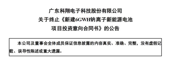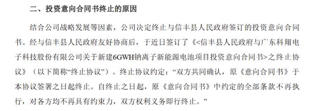 據(jù)科翔股份董秘辦的工作人員回應(yīng)稱,這是公司根據(jù)發(fā)展情況做出的決定,也表示公司還在繼續(xù)做鈉離子電池,后續(xù)應(yīng)該會(huì)披露進(jìn)展。信豐縣的終止項(xiàng)目是意向協(xié)議,而與大亞灣簽訂的是正式協(xié)議。