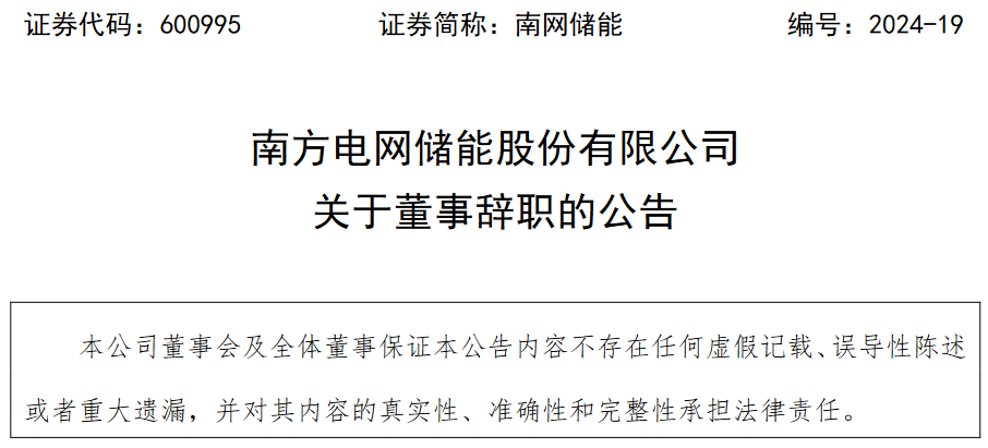 南網儲能于4月16日發(fā)布晚間公告稱,2024年4月16日,南方電網儲能股份有限公司(以下簡稱“公司”)董事會收到非獨立董事江裕熬先生遞交的書面辭職報告,江裕熬先生由于達到法定退休年齡,申請辭去公司董事及董事會科技創(chuàng)新委員會委員職務。