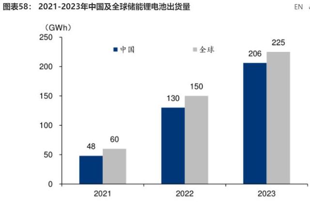 首先,鋰電池儲(chǔ)能在新型儲(chǔ)能裝機(jī)中占據(jù)絕對(duì)主導(dǎo)地位,將在較長時(shí)期作為儲(chǔ)能建設(shè)的主力,因此,儲(chǔ)能也成為鋰電池廠商兵家必爭之地。根據(jù)GGII,2023年全球儲(chǔ)能鋰電池出貨225GWh,同比增長50%,其中我國儲(chǔ)能鋰電池出貨206GWh,同比增長58%。國內(nèi)企業(yè)出貨在全球占比由2022年的86.7%提升至2023年的91.6%,寧德時(shí)代、比亞迪、億緯鋰能、瑞浦蘭鈞、海辰儲(chǔ)能等企業(yè)出貨領(lǐng)跑行業(yè)。