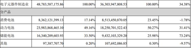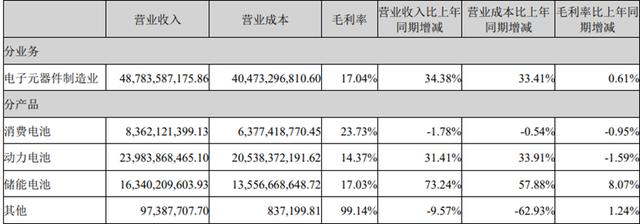 由于多數(shù)訂單為長期合同,儲能電池業(yè)務受價格戰(zhàn)影響較小,營業(yè)收入達到163.4億元,同比增長73.24%,占總營收的33.5%,毛利率也提升了8.07個百分點至17.03%。