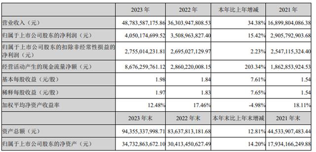 2023年,億緯鋰能實現(xiàn)營業(yè)收入487.8億元,同比增長32.38%;歸母凈利潤為40.5億元,同比增長15.42%,其中本部業(yè)務凈利潤為35.4億元,同比增長30.19%;扣非更是同比只增長2.23%;毛利率達到17.04%,同比增長0.61個百分點;凈利率達到9.27%,同比降低0.84個百分點。
