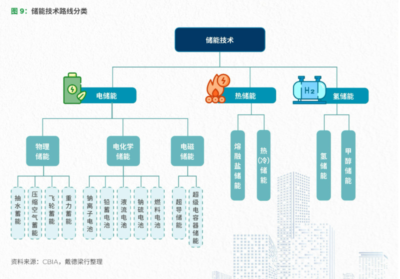 儲(chǔ)能,是指通過(guò)不同方式、利用特定的裝置或物理介質(zhì),將不同形式的能量?jī)?chǔ)存起來(lái),以便在需要時(shí)利用的技術(shù)。根據(jù)技術(shù)路徑不同,儲(chǔ)能形式主要分為電儲(chǔ)能、熱儲(chǔ)能和氫儲(chǔ)能三大類(lèi),其中電化學(xué)與物理儲(chǔ)能為現(xiàn)階段主要技術(shù)路線(xiàn)。儲(chǔ)能系統(tǒng)是新型電力系統(tǒng)有效的調(diào)峰調(diào)頻、平滑波動(dòng)手段及重要的備用資源,大力發(fā)展儲(chǔ)能對(duì)提高光伏、風(fēng)電等可再生能源利用率,實(shí)現(xiàn)“雙碳”目標(biāo)具有重要意義。