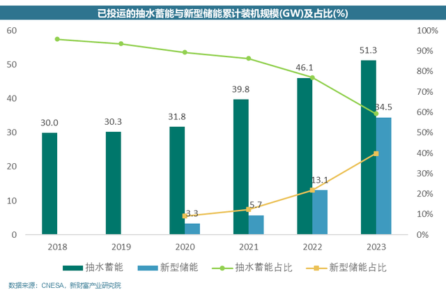 根據(jù)中國能源研究會儲能專委會及中關(guān)村儲能產(chǎn)業(yè)技術(shù)聯(lián)盟(CNESA)提供的數(shù)據(jù),到2023年底,抽水蓄能的累計(jì)裝機(jī)容量為51.3吉瓦,市場份額從2022年的77.1%降至59.4%。相比之下,新型儲能裝機(jī)量達(dá)到34.5吉瓦,容量為74.5吉瓦時,同比增長達(dá)到163.36%,市場份額也從2022年的21.9%上升到39.9%。