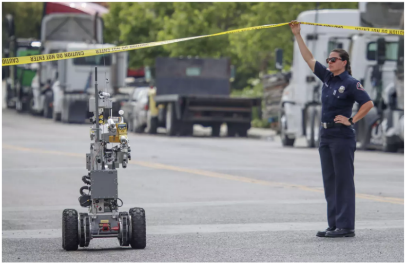 加州消防官員舉起警戒線,允許機器人進(jìn)入設(shè)施。(攝影:Sandy Huffaker,為《圣地亞哥聯(lián)合論壇報》提供)