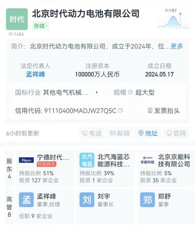 《中國經(jīng)營報》記者在天眼查上看到,5月17日,北京時代動力電池有限公司成立,法定代表人為孟祥峰,注冊資本10億元人民幣,是一家以從事電氣機(jī)械和器材制造業(yè)為主的企業(yè)。股東信息顯示,該公司由寧德時代、小米汽車科技有限公司、北汽海藍(lán)芯能源科技(北京)有限公司、北京京能科技有限公司共同持股。