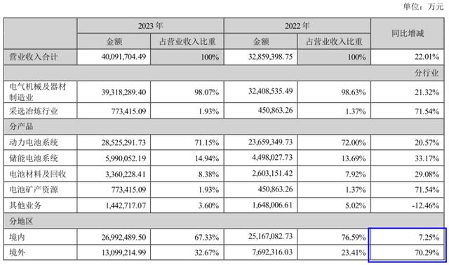 從銷售區(qū)域來看,海外市場已經(jīng)成為推動寧德時代營收增長的關(guān)鍵。據(jù)公司年報數(shù)據(jù)顯示,2023年全年,寧德時代境外市場實(shí)現(xiàn)銷售收入1309.92億元,同比增長70.29%,收入占比為32.67%,同比提升了9.16個百分點(diǎn),毛利率為25.19%。對比看,公司境內(nèi)市場銷售收入為2699.25億元,同比增長7.25%,銷售毛利率為21.8%。