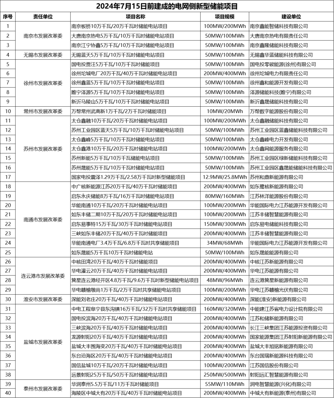 根據(jù)江蘇省2024年7月15日前建成的電網(wǎng)側(cè)新型儲(chǔ)能項(xiàng)目清單: