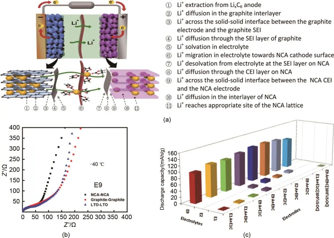 充電過程中石墨負(fù)極表面發(fā)生鋰沉積是造成LIBs在低溫下充電困難和循環(huán)性能衰減的重要原因,但是其并不是LIBs低溫放電容量衰退的主要原因,因?yàn)樵谙嗤瑮l件下LIBs在低溫下可以順利地進(jìn)行負(fù)極的鋰脫嵌(放電)。為了尋找低溫下鋰電池放電容量衰退的根本原因,Zhang等利用電化學(xué)阻抗譜(EIS)分析了低溫下LIBs的主體電阻(Rb)、SEI電阻(Rsei)以及電荷轉(zhuǎn)移電阻(Rct)的變化情況,實(shí)驗(yàn)發(fā)現(xiàn)當(dāng)溫度低于10 ℃時(shí),LIBs的Rct顯著增加,而Rb和Rsei增大不明顯,由此證明低溫下電荷轉(zhuǎn)移過程中的Rct是影響電池性能的主導(dǎo),而由于低溫導(dǎo)致的電導(dǎo)率下降和黏度上升等造成的Rb上升并不是低溫性能衰退的最主要原因。電荷轉(zhuǎn)移電阻Rct的提高主要是因?yàn)榈蜏叵落囯x子在充放電過程中發(fā)生電極反應(yīng)時(shí)的電荷轉(zhuǎn)移能壘阻礙變大。Li等將整個(gè)放電過程中鋰離子從負(fù)極遷移到正極的全部過程總結(jié)如圖4(a)所示,其中發(fā)生在電極和電解液主體的步驟①、②、⑩、 和⑥產(chǎn)生的電阻分別為Rb和Rsei,而在電極-電解液界面上發(fā)生的步驟③~⑤和⑦~⑨中產(chǎn)生的阻礙則體現(xiàn)在Rct中。文獻(xiàn)指出電荷轉(zhuǎn)移產(chǎn)生的Rct主要是由兩部分組成:①溶劑化后的鋰離子溶劑化鞘在接近電極時(shí)發(fā)生去溶劑化,鋰離子脫離溶劑化鞘形成“裸”離子;②去溶劑化后的鋰離子穿過電極表面SEI/CEI。研究者利用鈦酸鋰(LTO)正極特殊的嵌入電位不會形成SEI的特性,實(shí)現(xiàn)了去溶劑化和鋰離子穿過SEI/CEI過程的解耦,通過對比相同電解液下不同對稱電池在低溫下的EIS阻抗譜[圖4(b)],發(fā)現(xiàn)SEI/CEI的存在與否對Rct的影響很有限,說明了鋰離子插入正極或負(fù)極前的去溶劑化過程才是電荷轉(zhuǎn)移電阻Rct的主要貢獻(xiàn)者,尤其是在低溫下去溶劑化貢獻(xiàn)的電阻往往遠(yuǎn)大于其他的電荷轉(zhuǎn)移步驟,不同去溶劑化性能的電解液的低溫性能如圖4(c)所示。