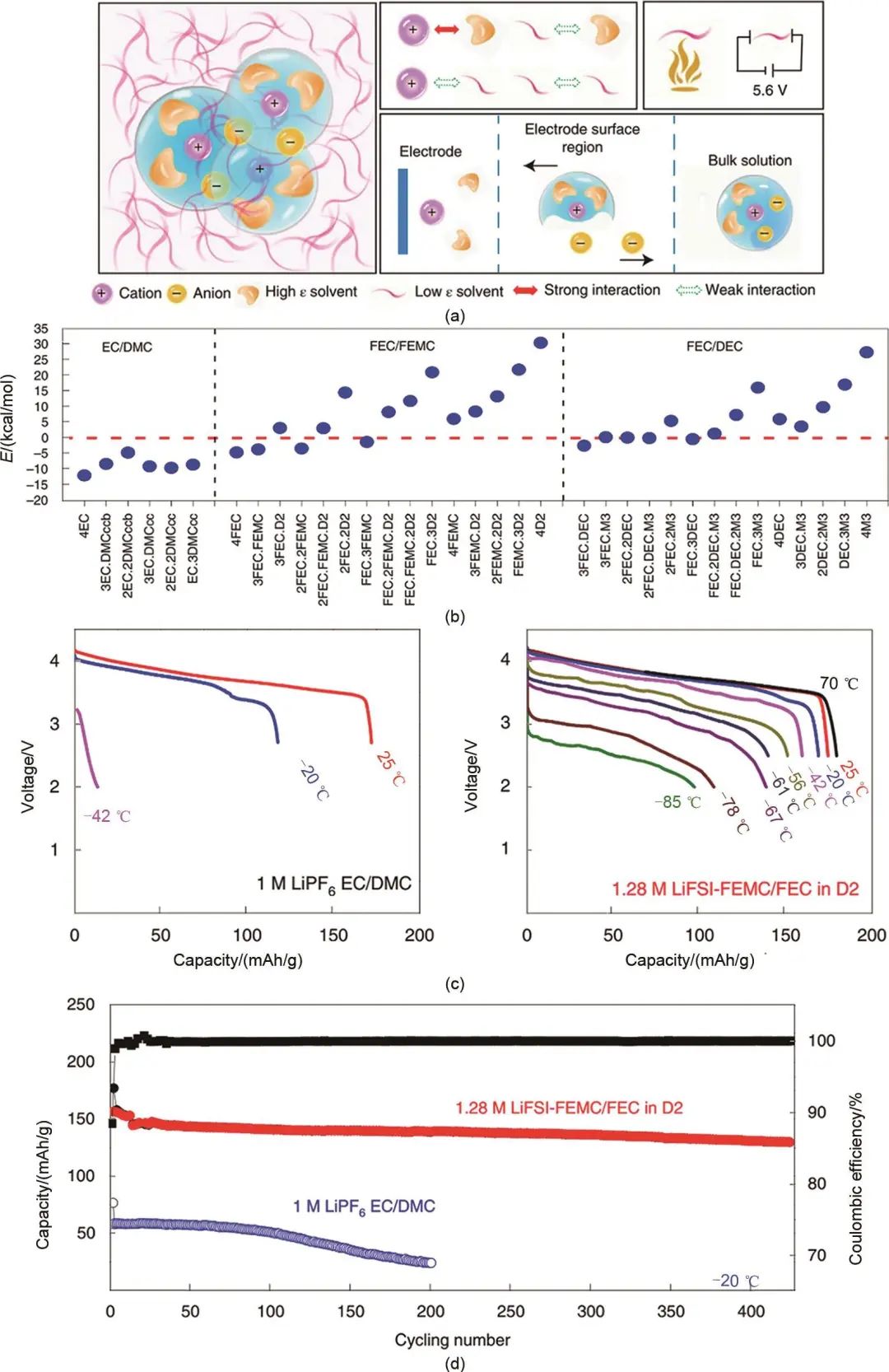 不同溫度下局部高濃電解液和常規(guī)電解液的 (c) 放電性能和 (d) 低溫循環(huán)性能對比
