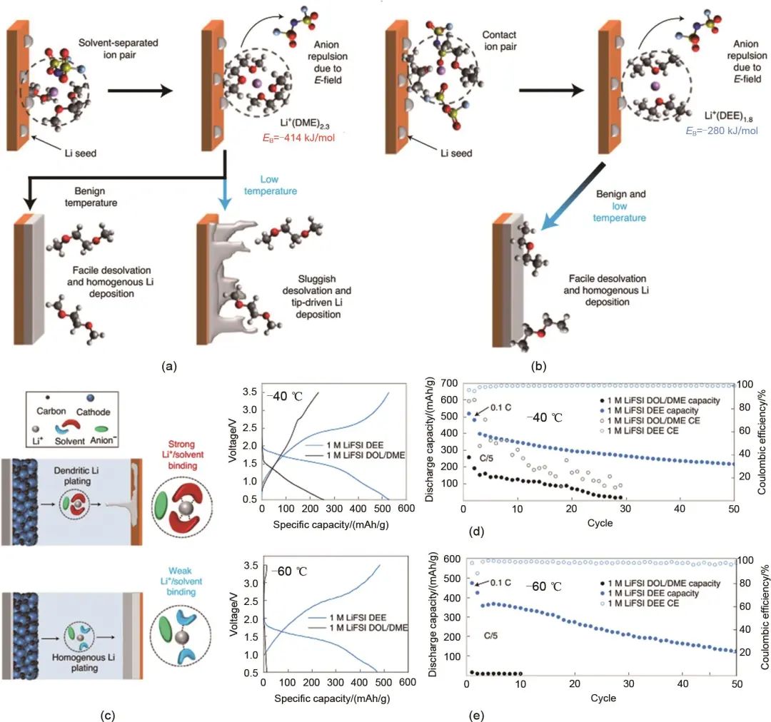 Holoubek等對比了常見的醚基電解液1 mol/L LiFSI DOL-DME和使用弱結(jié)合能力溶劑分子乙醚(DEE)的弱溶劑化能電解液1 mol/L LiFSI DEE,如圖7(a)所示,在DME/DOL電解液中,溶劑化結(jié)構(gòu)呈現(xiàn)溶劑分離離子對(SSIP)結(jié)構(gòu),根據(jù)DFT模擬計(jì)算結(jié)果,這一結(jié)構(gòu)中鋰離子平均與2.3個(gè)DME分子配位,即與溶劑的配位數(shù)是4.6 (每個(gè)DME分子有2個(gè)配位點(diǎn)),溶劑化結(jié)構(gòu)中不存在陰離子,模擬計(jì)算得到其溶劑結(jié)合能為-414 kJ/mol。而在DEE的電解液中,溶劑化結(jié)構(gòu)呈現(xiàn)接觸離子對(CIP)結(jié)構(gòu),這一結(jié)構(gòu)中鋰離子平均與1.8個(gè)DME分子配位,這明顯低于使用DME電解質(zhì)的SSIP結(jié)構(gòu),由于較少的溶劑分子配位,使得陰離子得以進(jìn)入CIP結(jié)構(gòu)的溶劑化鞘,形成了含有陰離子的溶劑化結(jié)構(gòu)。因此,DEE電解液形成的CIP結(jié)構(gòu)溶劑化鞘具有更低的去溶劑化能壘,模擬計(jì)算得到其溶劑結(jié)合能為-280 kJ/mol [圖7(b)~(c)]。文章將2種電解液運(yùn)用在Li/SPAN全電池上,對比其低溫容量和循環(huán)性能。如圖7(d)和圖7(e)所示,DEE電解液在-40 ℃下能實(shí)現(xiàn)519 mAh/g的放電容量(84%的室溫容量),而DME電解液只有236 mAh/g (38%的室溫容量),當(dāng)溫度到達(dá)-60 ℃時(shí),DEE電解液仍然能實(shí)現(xiàn)474 mAh/g (76%的室溫容量)的放電容量,而DME電解液則只能提供13 mAh/g (約3%的室溫容量)的容量。對比低溫循環(huán)性能,使用DME電解液的電池在-40 ℃下在初始兩個(gè)循環(huán)后就迅速下降,在-60 ℃下幾乎完全不能循環(huán),而DEE電解液則能夠穩(wěn)定低溫循環(huán)50圈以上。從電池的低溫性能可以看出,DEE電解液因?yàn)榫哂懈偷娜軇┙Y(jié)合能,去溶劑化過程中需要跨越的能量屏障更低,更容易發(fā)生去溶劑化過程,從而大大降低了低溫下的電荷轉(zhuǎn)移電阻和過電勢,提高了電荷傳遞的動(dòng)力學(xué),顯著提高了電池的低溫容量和循環(huán)性能。雖然具有弱結(jié)合能的溶劑分子能夠有效降低去溶劑化所需的能量屏障,但是在這些溶劑的實(shí)際使用過程中還需要綜合考慮其電化學(xué)穩(wěn)定性、離子導(dǎo)電性、界面成膜性以及安全性等。弱溶劑化的溶劑分子往往會造成鋰鹽陰陽離子的不完全解離,導(dǎo)致電解液的離子電導(dǎo)率明顯下降,且目前常見的弱結(jié)合能的溶劑分子例如DEE、1,4-二氧六環(huán)(1,4-DIOX)的電化學(xué)窗口都較窄,其氧化穩(wěn)定性較差,在高電壓下溶劑容易發(fā)生分解,這也導(dǎo)致使用這類溶劑的電解液不能與高壓正極適配,只能采用一些低電壓的正極(例如SPAN正極),導(dǎo)致電池能量密度下降。