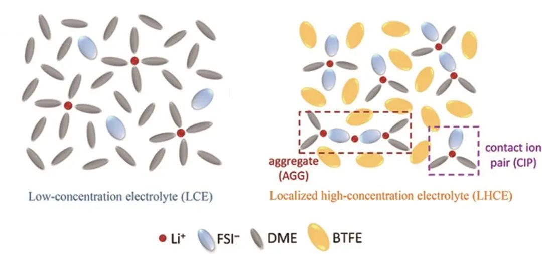 近些年來,高濃度電解液(HCEs)受到了廣泛的關(guān)注,通過提高電解液中的鋰鹽濃度,使得大量的鋰離子將全部溶劑完全配位,顯著提高溶劑的HOMO能級,提高電解液的電化學(xué)穩(wěn)定性。更重要的是當(dāng)溶劑分子和鋰離子的摩爾比大于4時(shí),溶劑分子不足以和大量的鋰離子完全配位,因此陰離子會“擠”進(jìn)溶劑化鞘中,形成接觸離子對的CIP結(jié)構(gòu)和聚集離子對的AGG結(jié)構(gòu),這一存在陰離子的溶劑化結(jié)構(gòu)相較于原有的SSIP結(jié)構(gòu)擁有更低的去溶劑化能壘,并且參與溶劑化的陰離子表現(xiàn)出更低的LUMO能級,在形成SEI/CEI過程中,溶劑化結(jié)構(gòu)中的陰離子會優(yōu)先還原分解,形成含有更多陰離子衍生的無機(jī)組分的SEI,其擁有更好的電化學(xué)性能和機(jī)械穩(wěn)定性、更有利的鋰金屬兼容性,顯著提高鋰金屬負(fù)極的循環(huán)穩(wěn)定性。但是HCEs的黏度高、潤濕性差、電導(dǎo)率低等問題使得其在低溫下幾乎不能使用,并且由于超高的鋰鹽黏度,電池的能量密度顯著下降,成本也不可接受,這些都限制了HCEs的實(shí)際運(yùn)用。為了解決HCEs的種種問題,研究人員提出使用非極性的低黏度稀釋劑來稀釋HCEs,非極性稀釋劑與鋰離子沒有相互作用,有效保留HCEs中特殊的CIP和AGG溶劑化結(jié)構(gòu)的同時(shí),可降低鋰鹽濃度和電解質(zhì)的黏度,提高了整體電解液的電導(dǎo)率。如圖8所示,這種采用稀釋高濃電解液的方式得到的電解液被稱為局部高濃電解液(LHCEs),其保留了HCEs優(yōu)點(diǎn)的同時(shí),極大地改進(jìn)了HCEs的缺點(diǎn),并且降低了成本,提高了整體的能量密度。