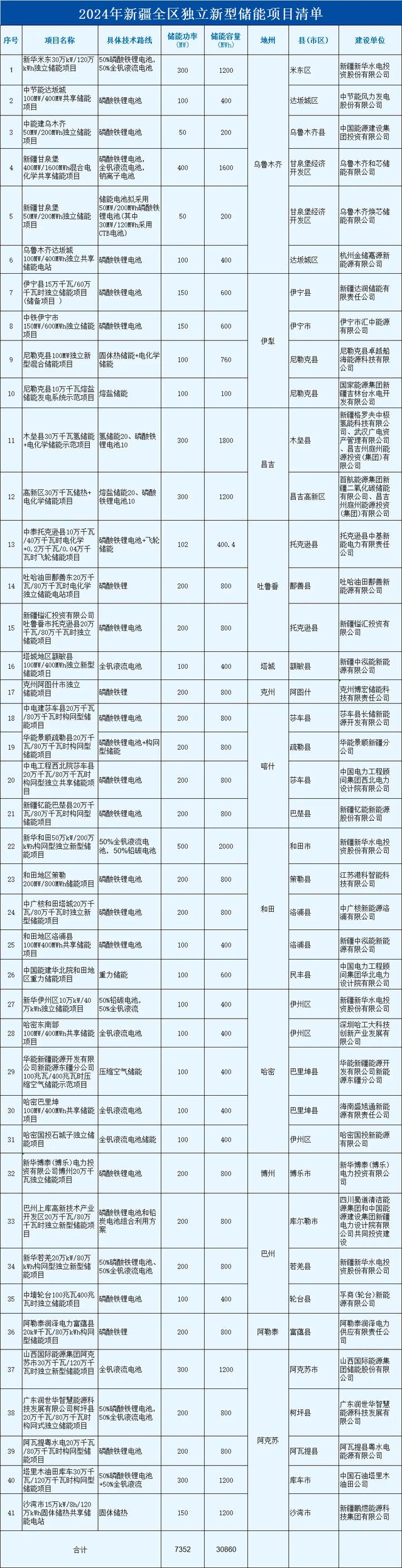 清單顯示,總共41個(gè)項(xiàng)目,總規(guī)模達(dá)7.35GW/30.86GWh。項(xiàng)目業(yè)主包括新華水電、中廣核、中石油、中能建、國(guó)家電投、華能等,其中,新華水電規(guī)模最大,5個(gè)項(xiàng)目,規(guī)模共1.3GW/5.2GWh。項(xiàng)目技術(shù)類(lèi)型廣泛涵蓋磷酸鐵鋰、全釩液流、鈉離子電池、壓縮空氣、重力儲(chǔ)能、鉛炭、氫儲(chǔ)、熱儲(chǔ)等多種類(lèi)型。其中,全釩液流電池項(xiàng)目12個(gè)(含混合儲(chǔ)能),規(guī)模超1.5GW/6GWh!