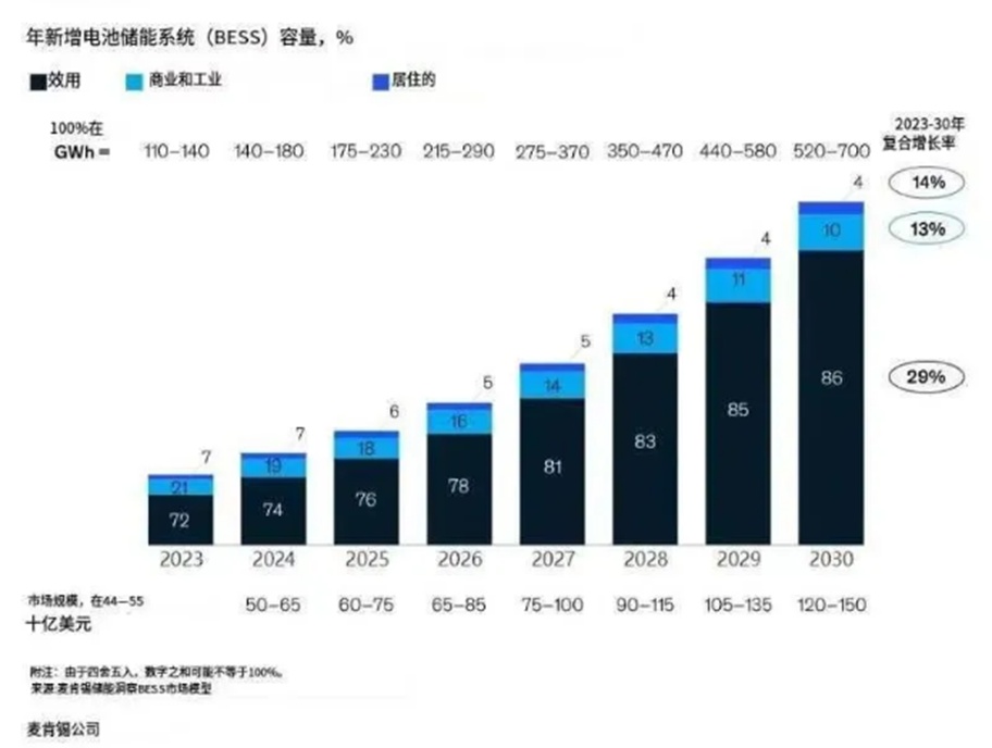 跨國知名咨詢公司麥肯錫預(yù)計(jì):公用事業(yè)規(guī)模的電化學(xué)儲能(已占新增年產(chǎn)能的大部分)將在未來六年中每年都保持增長29% 左右,是三個(gè)細(xì)分市場中增長最快的。2030年,電池儲能系統(tǒng)的市場容量可能會增加5倍。到2030 年,公用事業(yè)規(guī)模的年度裝機(jī)容量將達(dá)到 450 至 620 吉瓦時(shí)(gwh),公用事業(yè)規(guī)模的電化學(xué)儲能將占據(jù)當(dāng)年總市場的90%,全球電化學(xué)儲能全部市場需求將達(dá)到700gwh,1200億至1500 億美元,或1萬億人民幣左右。