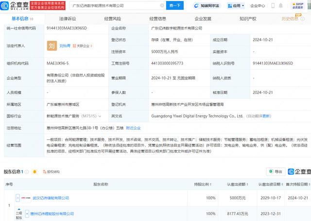 近日,廣東億緯數(shù)字能源技術(shù)有限公司成立,法定代表人為劉怡青,注冊資本為5000萬元人民幣,經(jīng)營范圍包含:合同能源管理;節(jié)能管理服務(wù);蓄電池租賃;機(jī)械設(shè)備租賃;光伏發(fā)電設(shè)備租賃;充電控制設(shè)備租賃等。企查查股權(quán)穿透顯示,該公司由億緯鋰能(300014)間接全資持股。